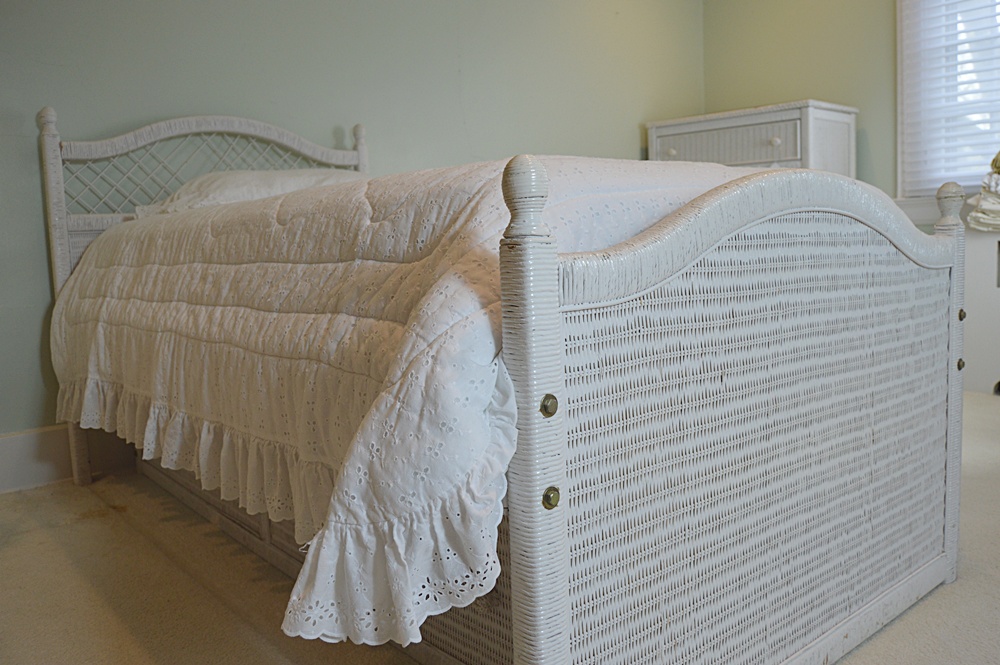 White Wicker Twin Trundle Bed | EBTH from ebth-com-production.imgix.net Single and twin beds are two names for the same bed size, which causes some confusion among the term twin bed simply refers to two identical single beds. Largo twin size day beds bedding, eternity. The twin over full bunk bed is beneficial in those circumstances when the room is large and comfort is the main criterion for placing the bed in the kid's room or elsewhere. 20th century american wicker beds and bed frames. Basic design single/twin wicker headboard shown in natural & white. Queen size beds (2) one seagrass bed and one wicker bed, twin or single beds (1) this is a trundle style twin bed with pull out single bed underneath, baby cribs (1) playpen/bed, sleep sofa or. Beds slat beds sleigh beds spindle beds storage beds traditional beds trundle beds unupholstered upholstered all deals sale <span. Shop wayfair for all the best twin wicker & rattan beds.